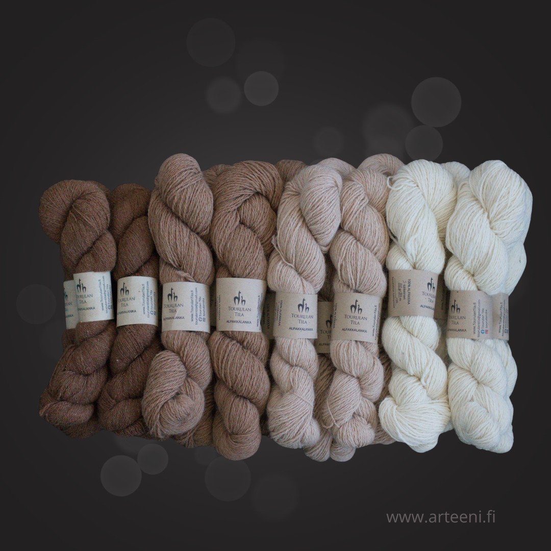 Tourulan tilan viitisenkymmentä alpakkaa ovat osa perheen arkea. Jokaisen eläimen villa on yksilöllistä, ja siksi myös langat ovat luonteeltaan uniikkeja. Näissä vyyhdeissä kulkee mukana tarina eläinten hyvinvoinnista, käsityöstä ja suomalaisen maaseudun rauhallisesta rytmistä.