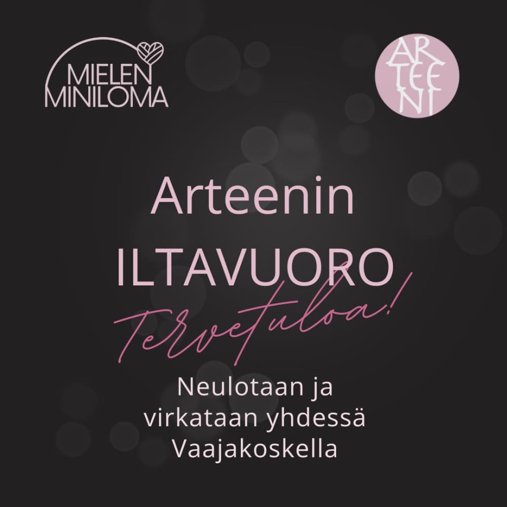 Arteenin iltavuoro sopii, niin neulojille, virkkaajille kuin rennosta käsityöhetkestä kiinnostuneille. Jotta saamme kaikki nauttia hetken minilomasta, pyydän alle 10-vuotiaat lapset jätettäväksi kotiin.